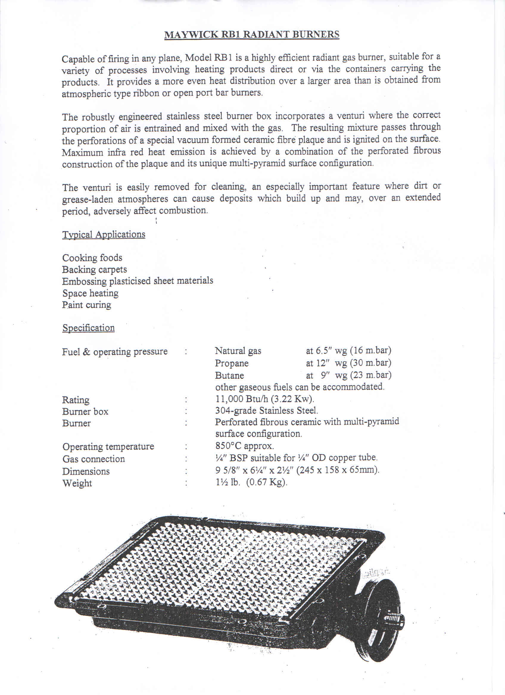 Capable of firing in any plane, Model RB1 is a highly efficient radiant gas burner, suitable for a variety of processes involving heating products direct or via the containers carrying the products. It provides a more even heat distribution over a larger area than is obtained from atmospheric type ribbon or open port bar burners.